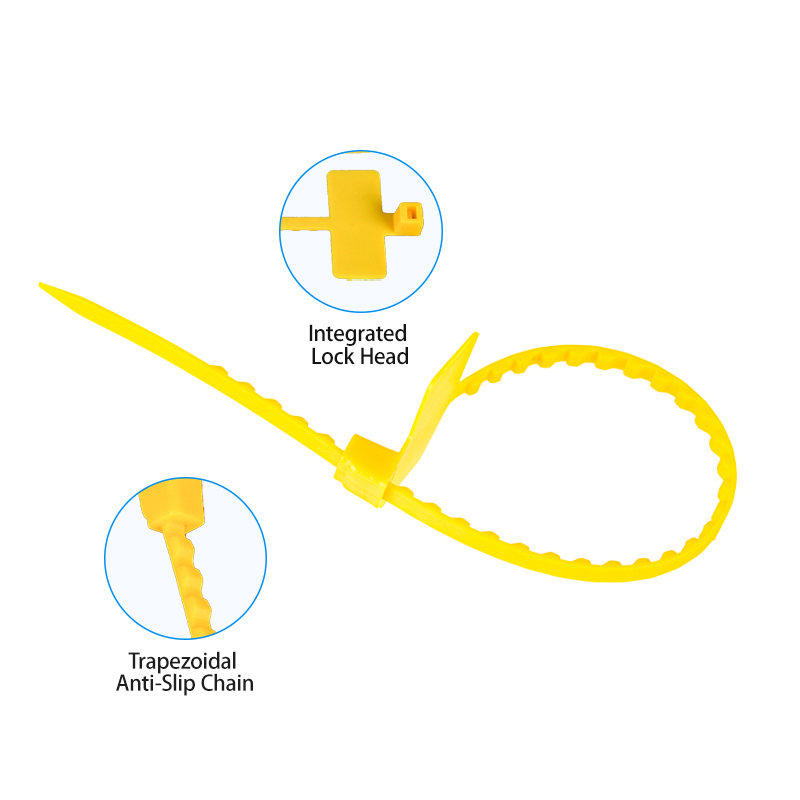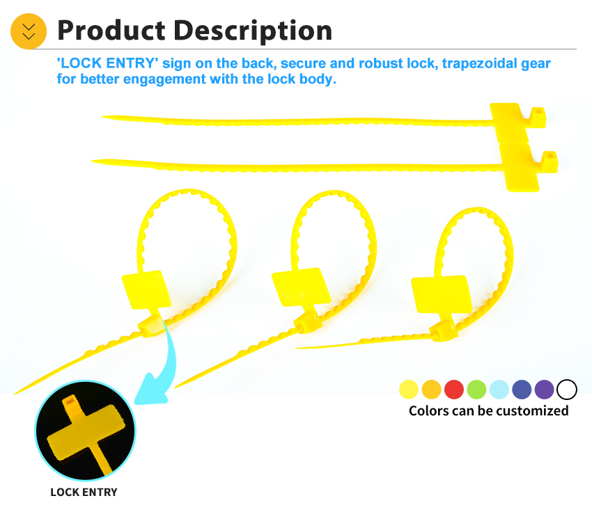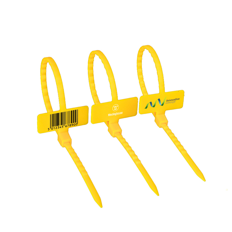 Plastic Security Seal HYPS-C01 is a newly designed plastic pull tight seal. This tamper evident seal is available with 180 mm or custom adjustable strap and fits any closure larger than 2.3mm. The tamper evident seal features a stainless steel locking insert and Tear Away Tab allowing for easy removal by hand. The 1" x 2" printing area allowing for unsurpassed customization.