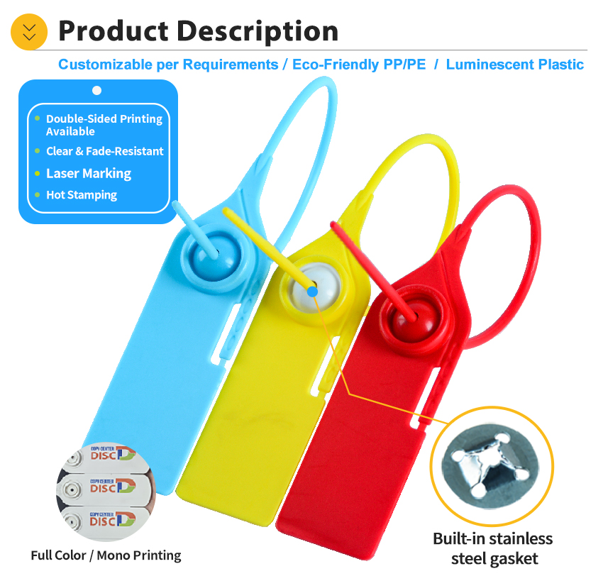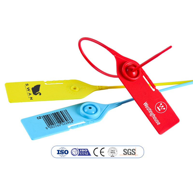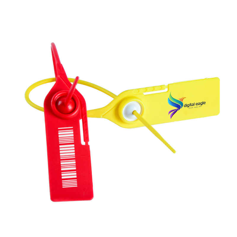 Plastic Security Seal HYPS-A05 is a newly designed plastic pull tight seal. This tamper evident seal is available with 180 mm or custom adjustable strap and fits any closure larger than 2.3mm. The tamper evident seal features a stainless steel locking insert and Tear Away Tab allowing for easy removal by hand. The 1" x 2" printing area allowing for unsurpassed customization.