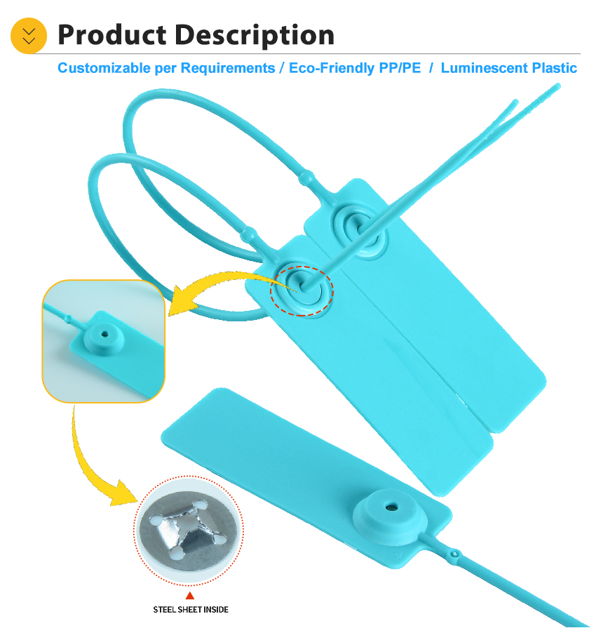 Plastic Security Seal HYPS-A09 is a newly designed plastic pull tight seal. This tamper evident seal is available with 180 mm or custom adjustable strap and fits any closure larger than 2.3mm. The tamper evident seal features a stainless steel locking insert and Tear Away Tab allowing for easy removal by hand. The 1" x 2" printing area allowing for unsurpassed customization.