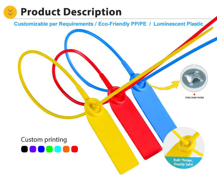 Plastic Security Seal HYPS-A15 is a newly designed plastic pull tight seal. This tamper evident seal is available with 180 mm or custom adjustable strap and fits any closure larger than 2.3mm. The tamper evident seal features a stainless steel locking insert and Tear Away Tab allowing for easy removal by hand. The 1" x 2" printing area allowing for unsurpassed customization.