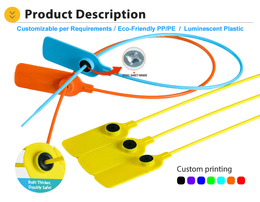 Plastic Security Seal HYPS-A20 is a newly designed plastic pull tight seal. This tamper evident seal is available with 180 mm or custom adjustable strap and fits any closure larger than 2.3mm. The tamper evident seal features a stainless steel locking insert and Tear Away Tab allowing for easy removal by hand. The 1" x 2" printing area allowing for unsurpassed customization.