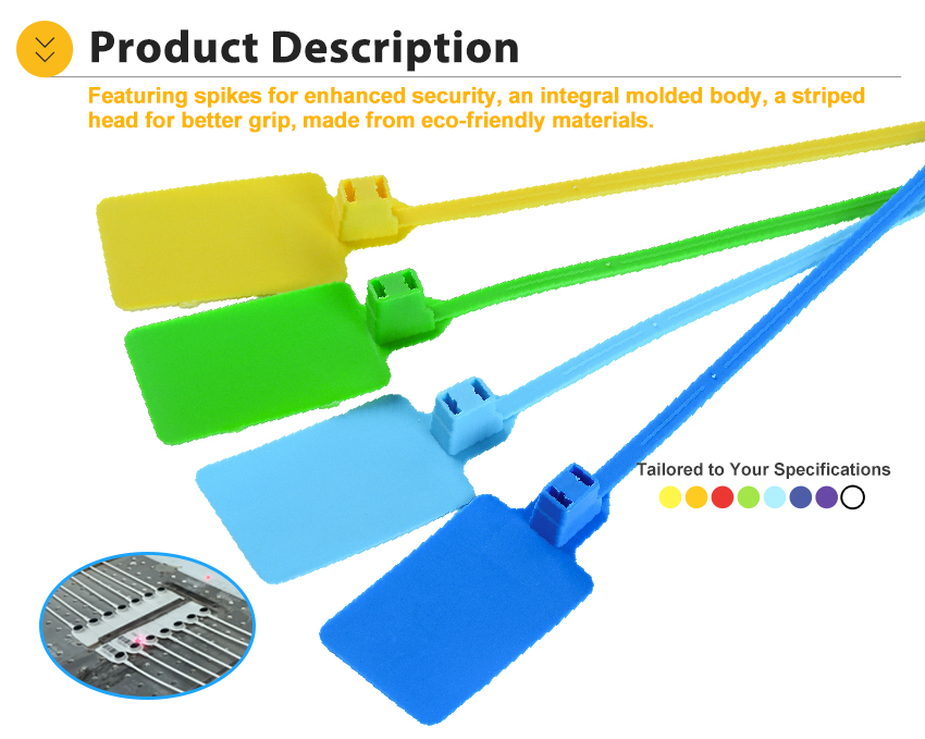 Plastic Security Seal HYPS-C11 is a newly designed plastic pull tight seal. This tamper evident seal is available with 180 mm or custom adjustable strap and fits any closure larger than 2.3mm. The tamper evident seal features a stainless steel locking insert and Tear Away Tab allowing for easy removal by hand. The 1" x 2" printing area allowing for unsurpassed customization.