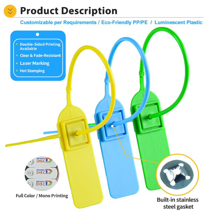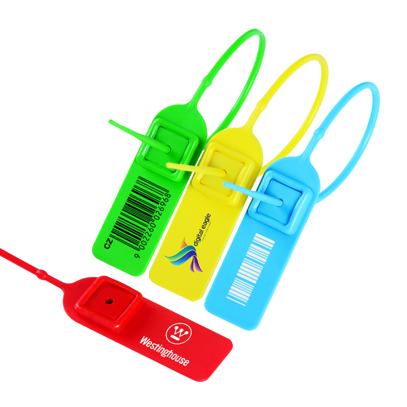 Plastic Security Seal HYPS-A02 is a newly designed plastic pull tight seal. This tamper evident seal is available with 180 mm or custom adjustable strap and fits any closure larger than 2.3mm. The tamper evident seal features a stainless steel locking insert and Tear Away Tab allowing for easy removal by hand. The 1" x 2" printing area allowing for unsurpassed customization.