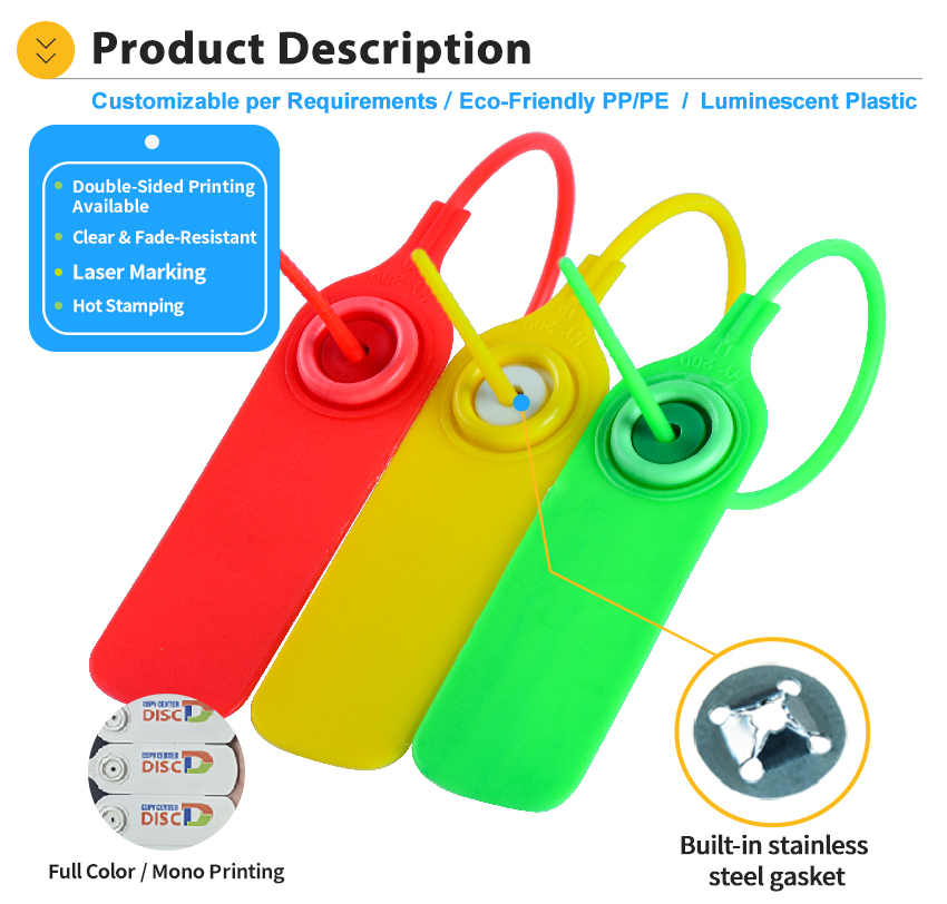 Plastic Security Seal HYPS-A04 is a newly designed plastic pull tight seal. This tamper evident seal is available with 180 mm or custom adjustable strap and fits any closure larger than 2.3mm. The tamper evident seal features a stainless steel locking insert and Tear Away Tab allowing for easy removal by hand. The 1" x 2" printing area allowing for unsurpassed customization.